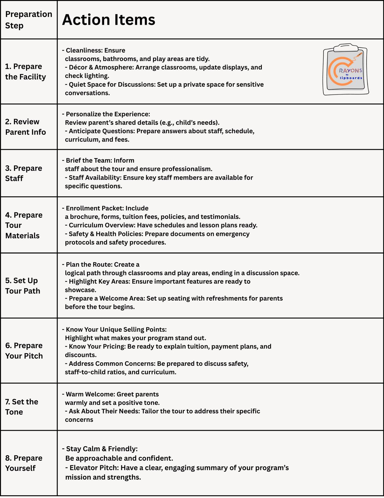 By preparing thoroughly and creating a welcoming, informative tour experience, you set the stage for a positive first impression that can lead to long-term relationships with families.